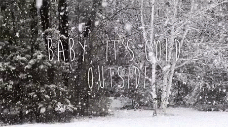 A serene black and white winter scene with falling snow and the text 'Baby, It's Cold Outside' overlaid.