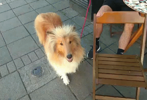 A beautiful Collie dog on a leash stands attentively next to a man sitting at an outdoor table.