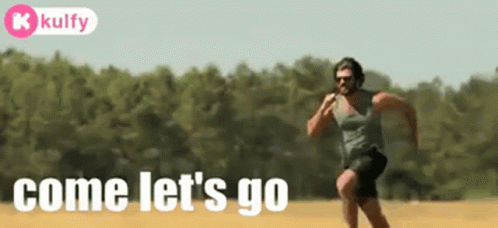 Vijay Deverakonda runs energetically in a field, with the motivational phrase 'Come let's go' displayed.