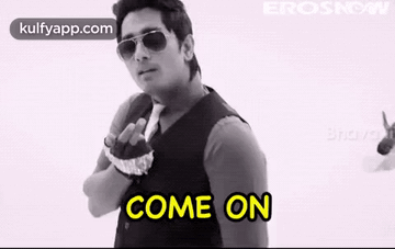 Siddharth in sunglasses and a vest, gesturing 'Come On' with a stylish head nod, showcasing enjoyment and dance.