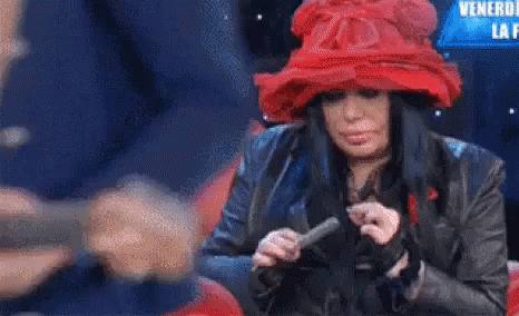 Loredana Bertè, wearing a red hat, looks confused while holding a small object.