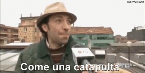 Herbert, a man in a hat, speaks into a microphone, exclaiming 'Come una catapulta' (Like a catapult).