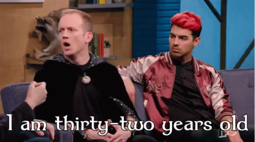 Neil Campbell, as Maxwell Keeper on Comedy Bang Bang, declares his age as thirty-two years old, with Joe Jonas listening.