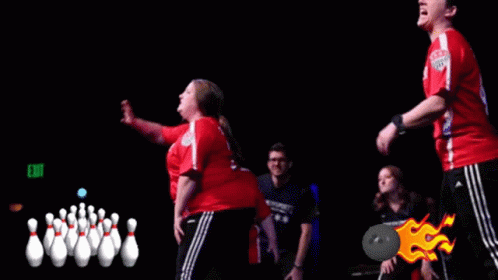 A group performs a Comedysportz improv bowling act, mimicking bowling actions with animated pins and ball graphics.