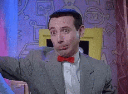 Pee Wee Herman, portrayed by Paul Reubens, displays a nervous smile that turns into a grin.