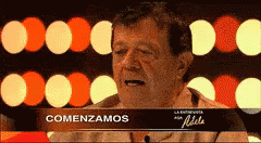 Iconic Mexican TV personality Chabelo says 'Comenzamos' during an interview segment, likely with Adela.