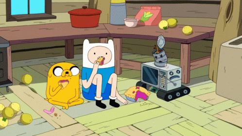 Finn and Jake from Adventure Time enjoying pie on the floor, surrounded by lemons.