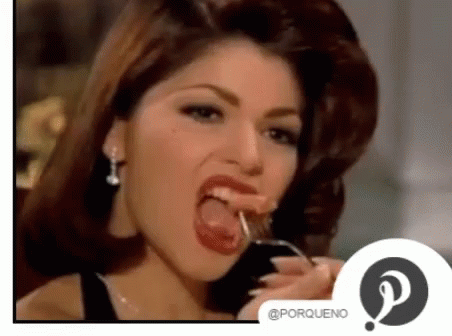 Woman with dark hair and red lipstick eating a bite from a fork, opening her mouth wide.