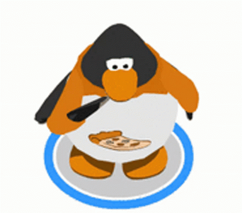 A cartoon penguin enjoys a slice of pizza, taking bites from it with a satisfied expression.