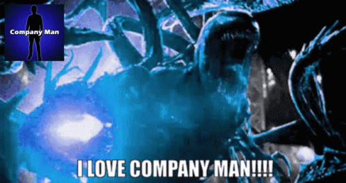 A creature resembling Venom with glowing blue elements, alongside a 'Company Man' silhouette and text 'I LOVE COMPANY MAN!!!'