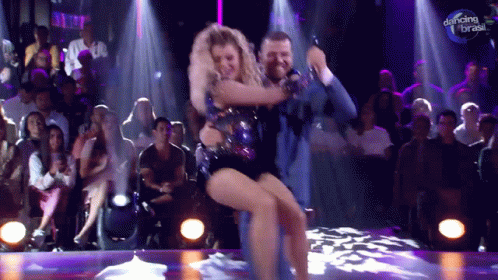 Energetic couple performs a dynamic dance routine on stage during a 'Dancing Brasil' competition.