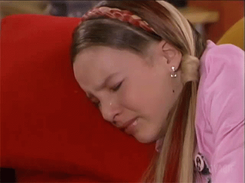 A young girl from 'Complices Al Rescate' crying with her head resting on a red pillow.