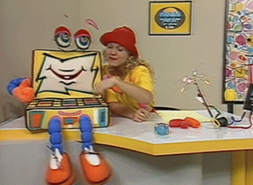 Eliana interacts with a friendly cartoon computer character, Computador Teclas, at a colorful desk.