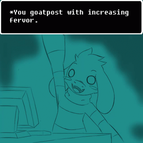 Asriel Dreemurr from Undertale enthusiastically typing a 'goatpost' on a computer keyboard.