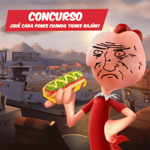 Condorito shows a range of funny expressions while holding a hot dog, part of a contest about craving faces.