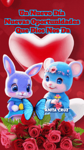 Cute animated bunny and mouse with a butterfly, surrounded by roses. Message: 'Un Nuevo Día Nuevas Oportunidades Que Dios Nos Da' by ANITA CRUZ.