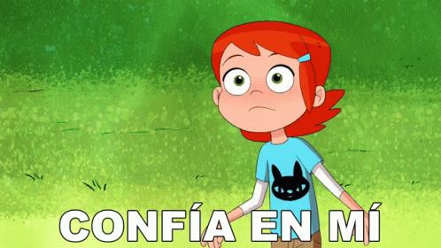 Gwen from Ben 10, with red hair and a cat shirt, asks viewers to 'Confía En Mí' (Trust Me) with a surprised expression.