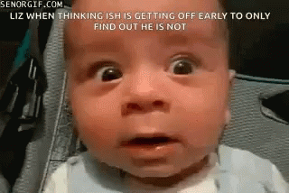 A baby's face transitions from sleep to wide-eyed confusion and sadness, reacting to the news of not getting off early.