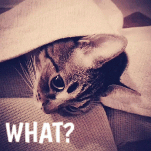 A cat peeks from under a blanket with wide eyes, looking utterly confused and surprised, with the word "WHAT?" displayed.