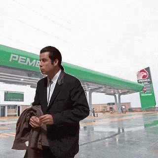 John Travolta looking confused at a Pemex gas station, holding his jacket, in a popular meme format.