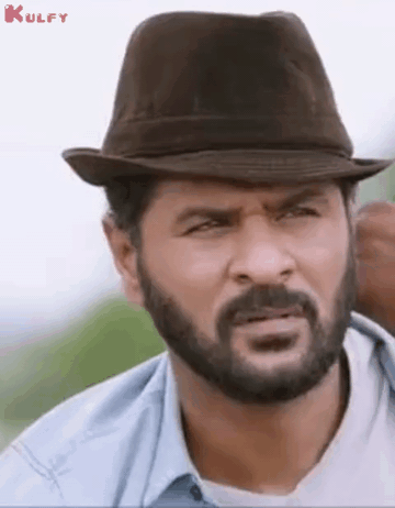 Prabhu Deva, wearing a hat and blue shirt, looks confused and thoughtful.