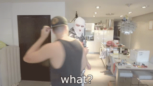 A person in a white balaclava and sunglasses looks confused as the caption "*confusion intensifies*" appears.