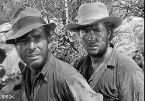 Humphrey Bogart and another man, both wearing hats, look confused and concerned in a scene from Sierra Madre.