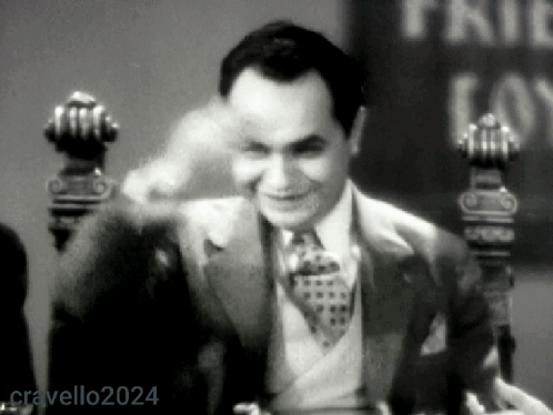 Edward G. Robinson smiles broadly and gestures triumphantly, celebrating a victory or good news.