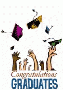 Animated graphic with 'Congratulations GRADUATES' text and cartoon hands tossing graduation caps.