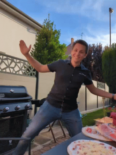 A man with outstretched arms happily dances in a backyard, next to a barbecue grill, enjoying the moment.