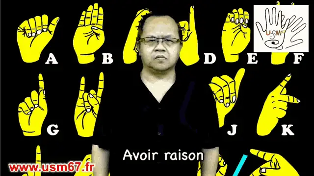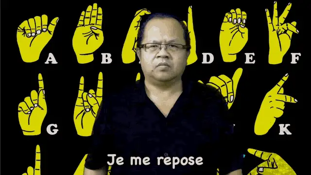 A man with glasses demonstrates sign language for "Content" with an alphabet display.