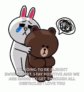 Cony the rabbit hugs and comforts Brown the bear, sharing a message of hope and love.