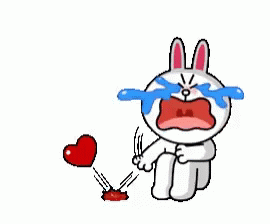 Cony, the cartoon rabbit, cries intensely, then holds a red heart, expressing deep sadness.