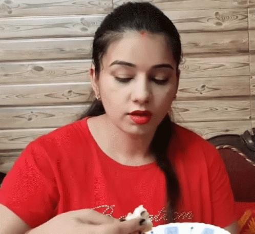 Cook With Monika is seen eating a piece of delicious food from a bowl, enjoying her meal.