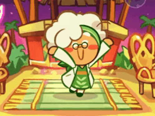 Cauliflower Cookie from Cookie Run Oven Break happily dances in a vibrant, cartoonish setting.