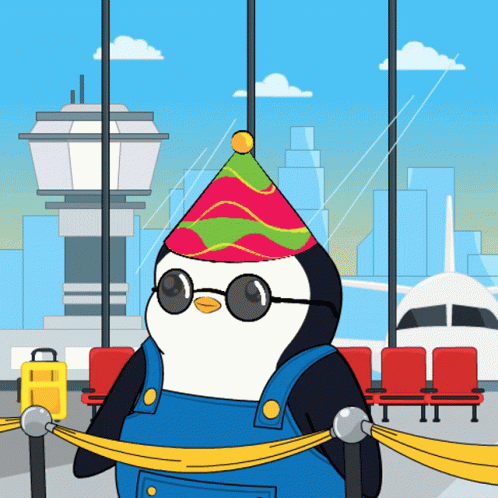 Pudgy Penguin character, Primo, wearing a party hat and sunglasses, celebrates with a party blower.