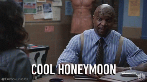 a man in a striped shirt and tie is sitting at a desk with the words cool honeymoon written on it