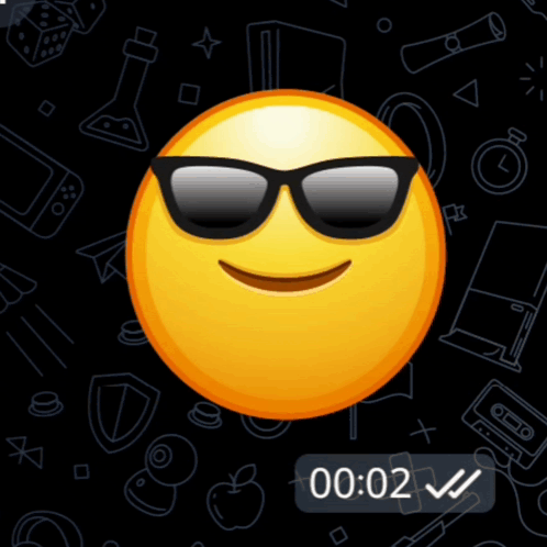 A cool yellow emoji wearing sunglasses with a sparkling tooth, set against a dark background.