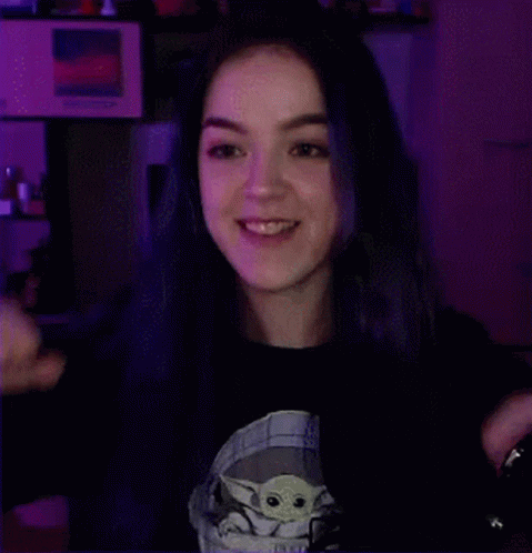A woman with dark hair gives a double thumbs up gesture against a purple background, wearing a Baby Yoda shirt.