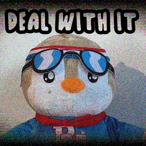 A plush penguin wearing cool sunglasses, with the iconic 'DEAL WITH IT' meme text displayed above it.