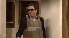 Jimmy Fallon in sunglasses and a tactical vest reacts to a person in a Grim Reaper costume.