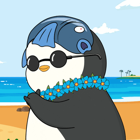 A cartoon penguin wearing sunglasses, a fish hat, and a lei, posing on a sunny beach.