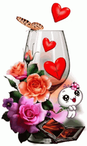A beautiful Copa De Corazones glass surrounded by vibrant roses, floating hearts, a butterfly, and a cute cartoon character.
