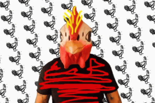 Copete Juangallo, a person wearing a chicken mask, adjusts the mask's comb in front of a rooster pattern.