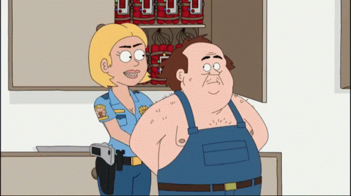 A female police officer arrests a shirtless man in overalls, holding a red and green stick. Dynamite visible.