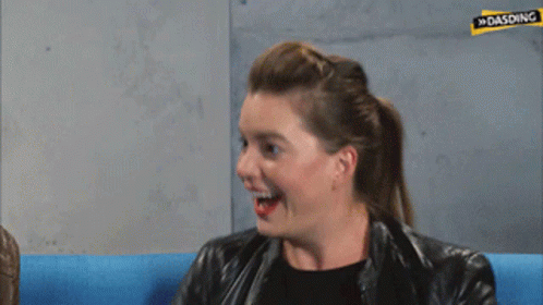 Cora, wearing a black leather jacket, raises her arms in an excited and happy reaction.