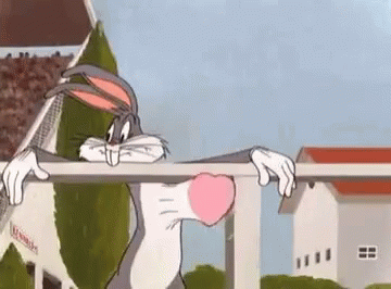 Bugs Bunny leans over a railing, holding a pink heart in his mouth, expressing love.