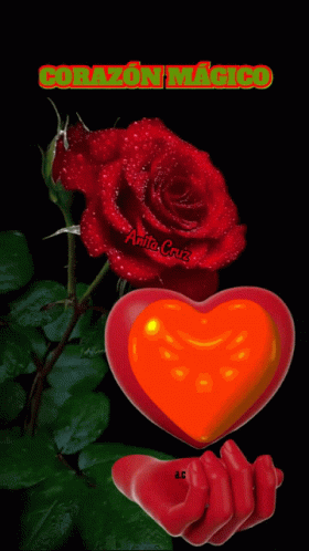 A vibrant red rose with water droplets, accompanied by a magical heart changing colors from green to orange, held by a red hand.