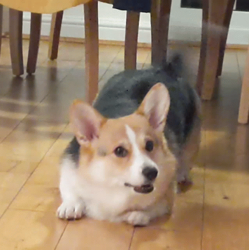 Adorable Corgi Poppy wags her tail while lying on a wooden floor, looking towards the camera.