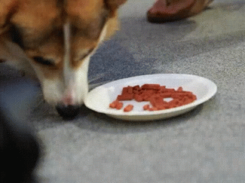 A cute Corgi dog enjoys its lunch from a white plate, wearing a colorful bandana on Corgiaday.